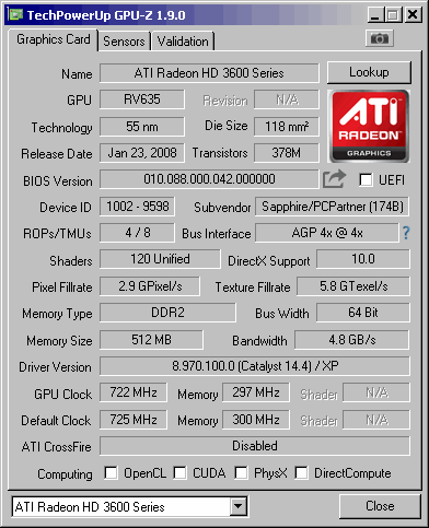 Sapphire - core 722MHz, memory 594MHz 64bit.